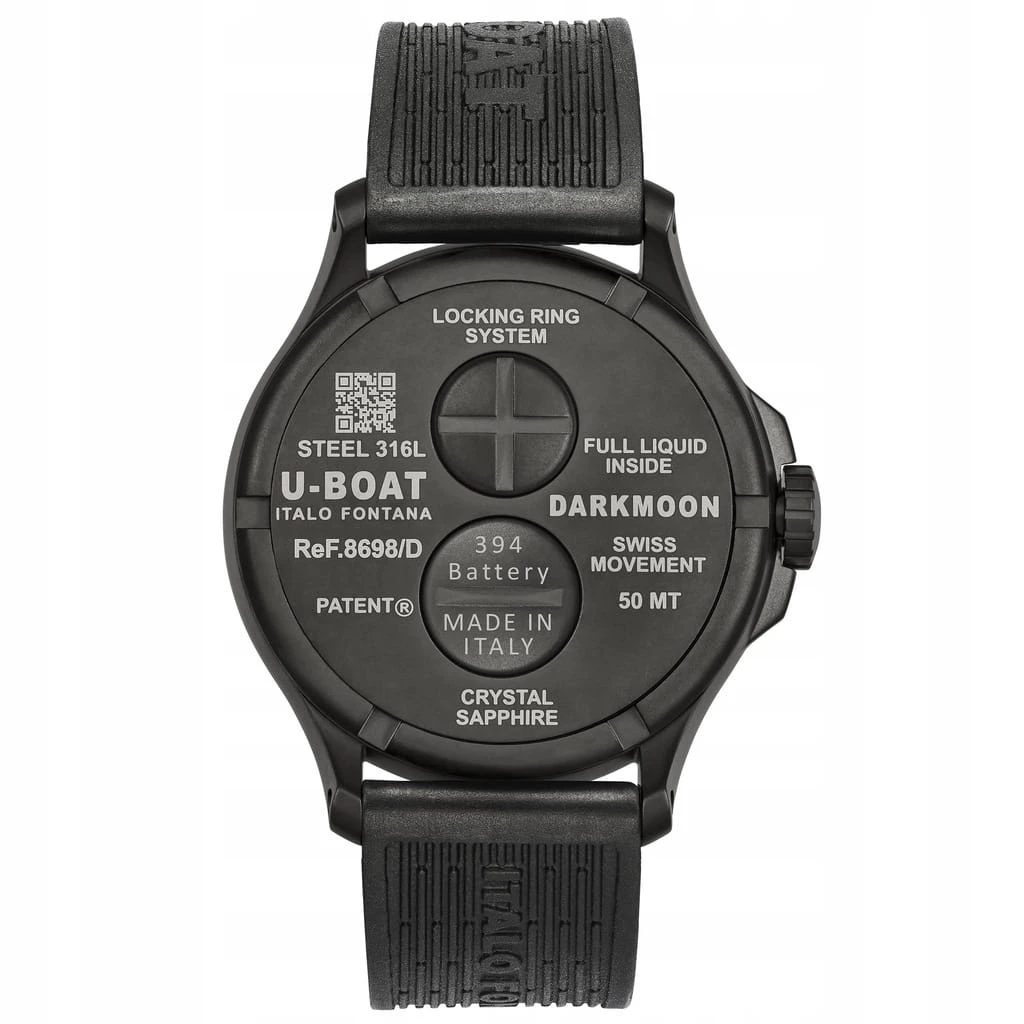 Pasek modelu U-BOAT Darkmoon Imperial Blue SS 8704A wykonany jest z ultra odpornej gumy wulkanizowanej w kolorze czarnym, posiada tłoczone logo marki oraz stalową klamrę. Zakręcany dekiel wyposażony jest w nowatorski system pierścieni blokujących. Napędem dla czasomierza jest wysoce precyzyjny i niezawodny, szwajcarski mechanizm kwarcowy Ronda 712.3 smarowany specjalnym olejem. Zegarek reprezentuje włoski kunszt rzemieślniczy, innowacyjne i niezależne podejście twórcy do kwestii stylu oraz technologii i dlatego stanowi idealną ofertę dla Panów ceniących nowe doświadczenia, oraz elitarny standard.