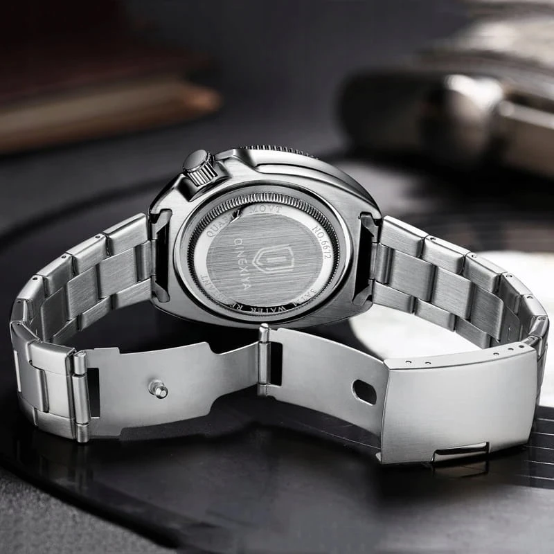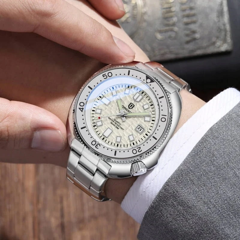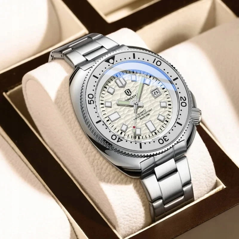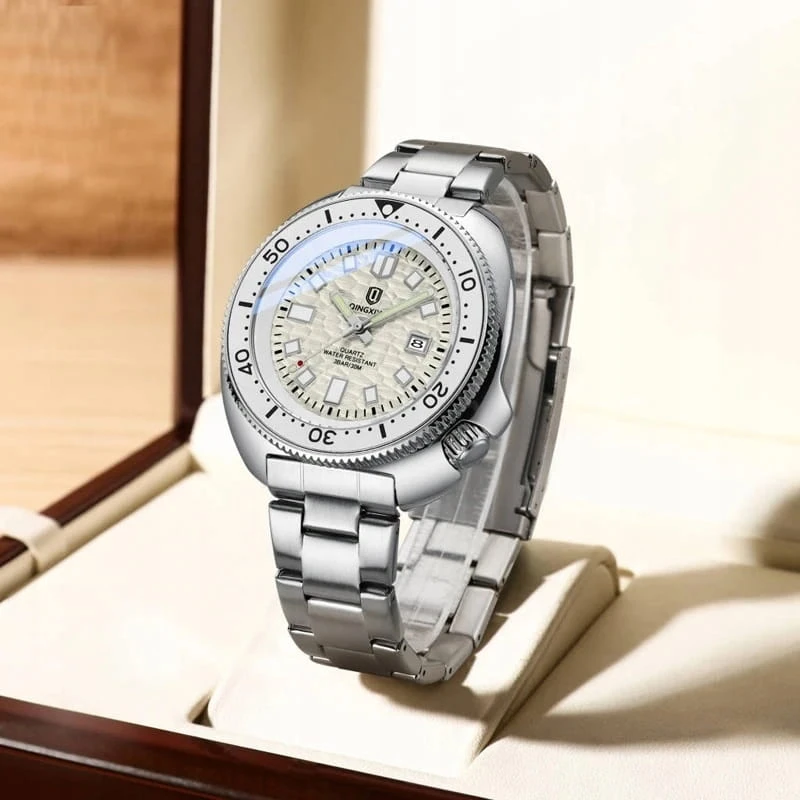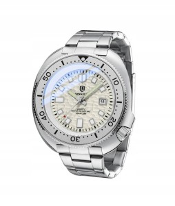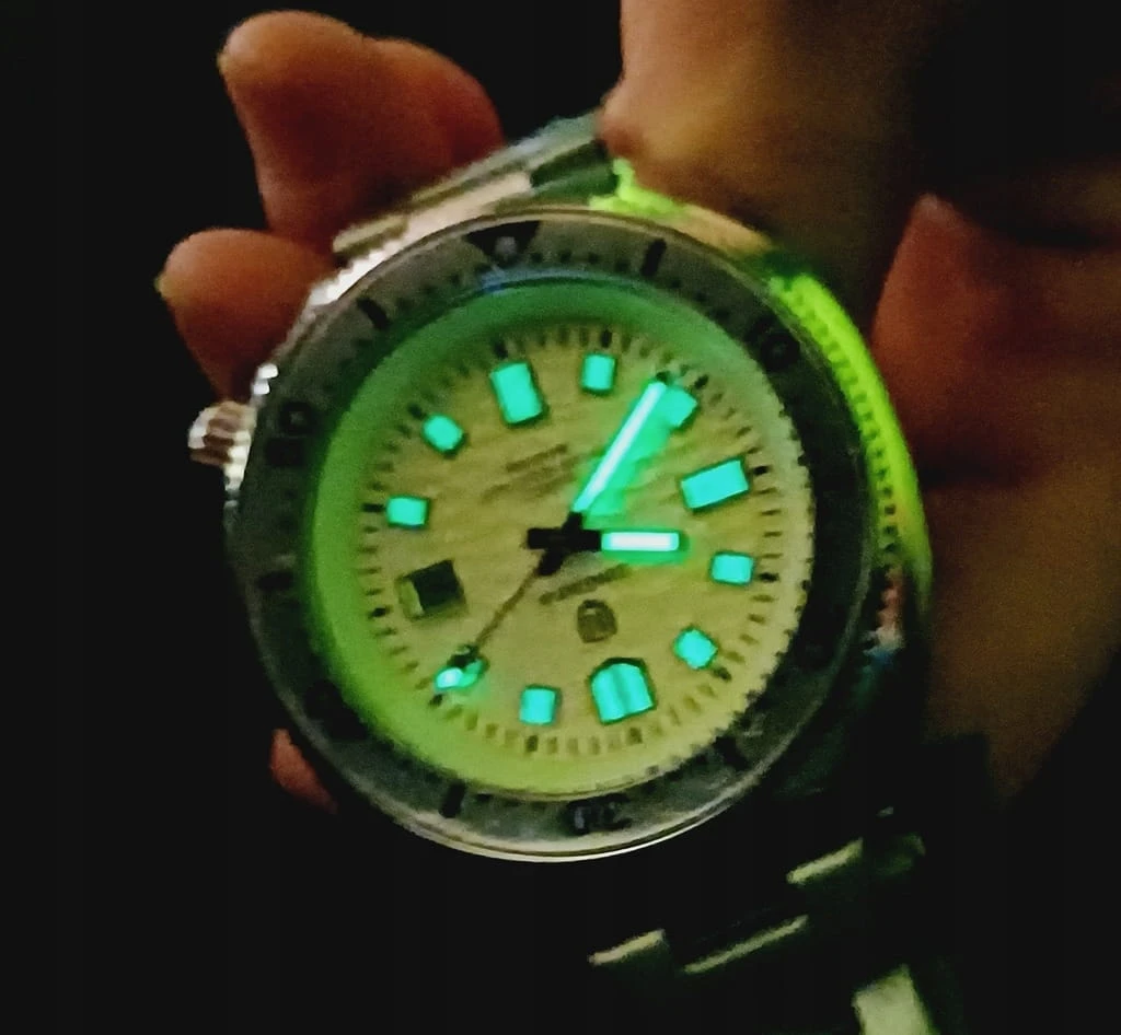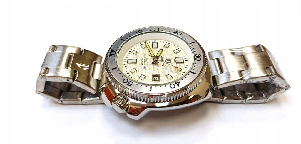 Masywny zegarek luminous na bransolecie, datownik, obrotowy pierścień, stal