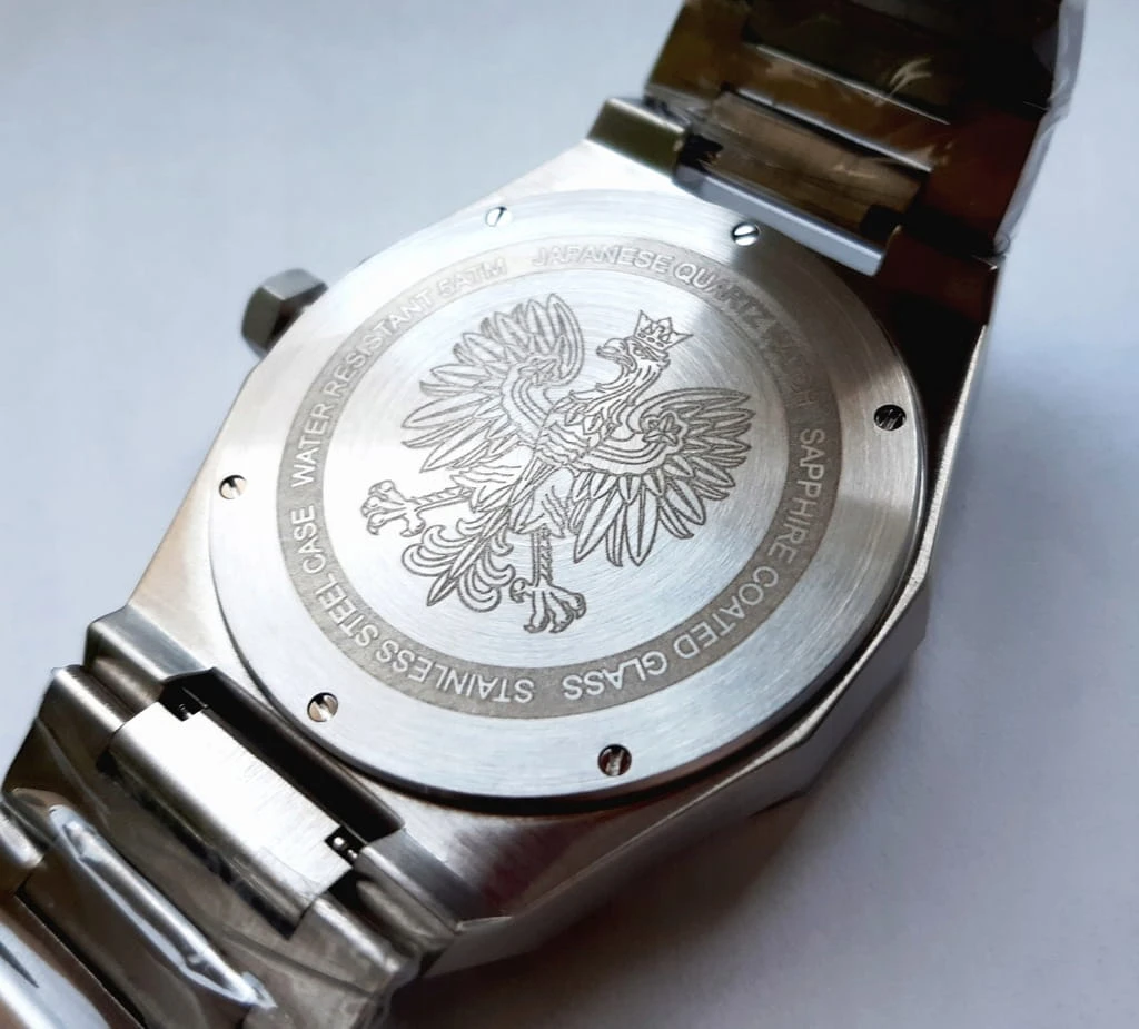 Unikalny, męski zegarek z polskim datownikiem. Masywna stalowa konstrukcja gwarantuje bezproblemowe korzystanie z zegarka przez kolejne lata. Japoński mechanizm gwarantuje właściwą poprawność działania. Przykręcany dekiel zegarka dodatkowo ozdobiony jest wygrawerowanym orłem w koronie - podkreślając jego unikalność.