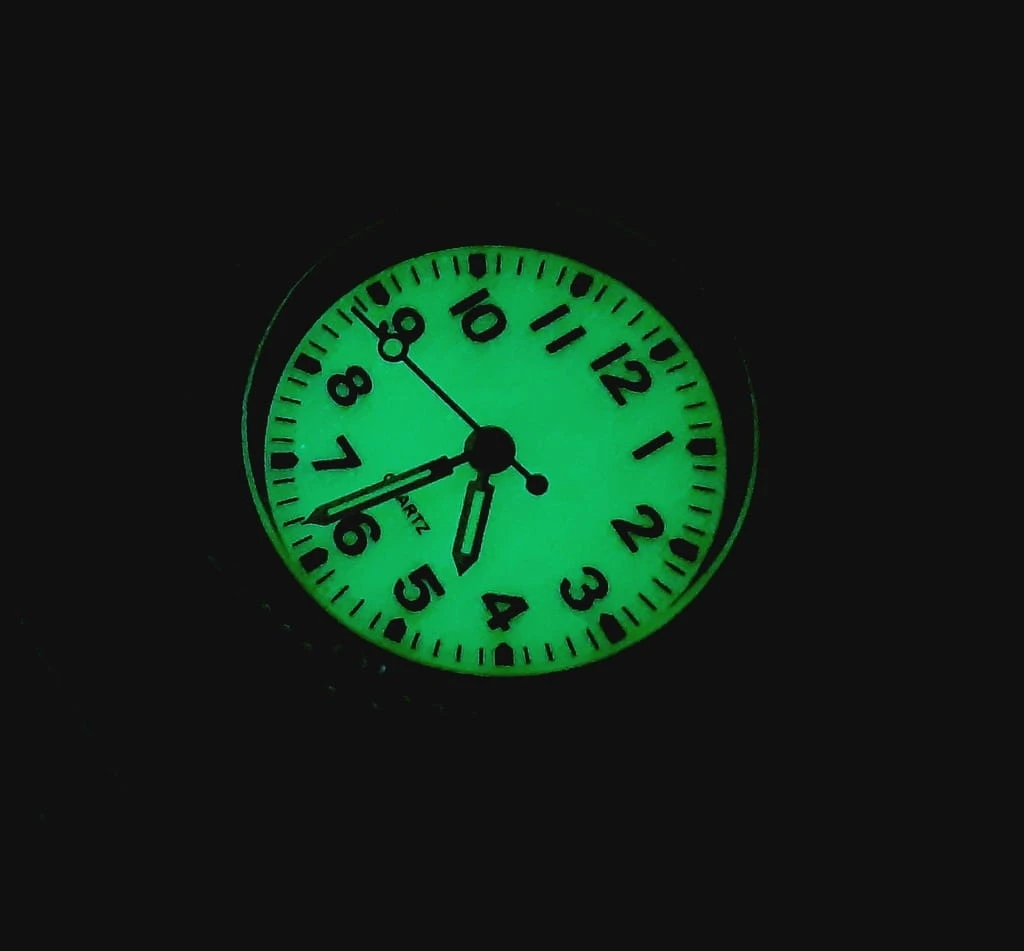 Neobride: fosforyzowana tarcza oraz wskazówki, świecące w ciemności.